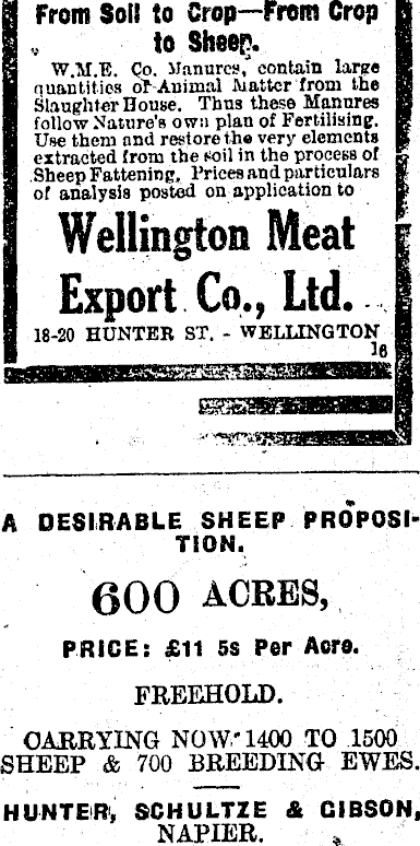 From soll to Crop—From Crop to Sheep. W.M.E. Qo. Manures/ contain large quantities oT-Animal JUattcr from the Slaughter House. Thus these Manures follow Nature's own plan of Fertilising. Use them nnd restore the very elements extracted from the Mil in the process of Sheep Fattening, Prices and particulars of analysis posted on application to Wellington Meat Export Co., Ltd. 18-20 HUNTER ST. - WELLINGTON 18 A DESIRABLE SHEEP PROPOSITION. 600 ACRES, PRICE: £ll 5s Per Aero. FREEHOLD. CARRYING NOW" 1400 TO 1500 SHEEP & 700 BREEDING EWES. HUNTER, SCHULTZE & GIBSON, NAPIER. a