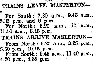 TRAINS LEAVE MASTEBTON—- * For South: 7.30 a.m., 9.46 a.m., 3.33 p.m. and 6 p.m. For North: 6.20 a.m., 10 a.m., 11.50 a.m., 5.15 p.m. TRAINS ARRIVE MASTERTON— From North: 9.25 a.m., 3.25 p.m., 5.50 p.m., 10.15 p.m. From South: 9.45 a.m., 11.40 a.m., 4.30 p.m.y 8.35 p.m.