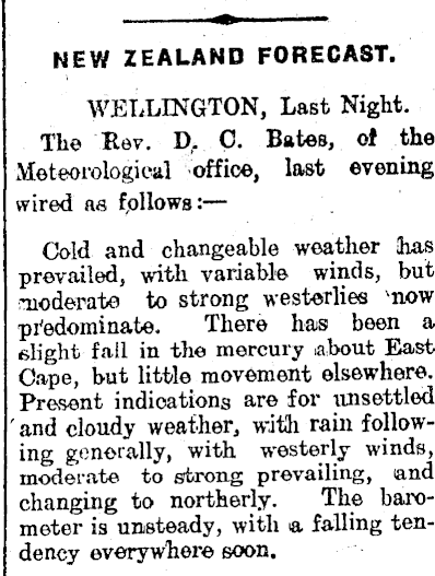 m NEW ZEALAND FORECAST. WELLINGTON, Last Night. The Rev. D, C. Bates, o! the Meteorological office, last evening wired as fpllowg:— Cold and changeable weather !has prevailed, with variable winds, but moderate to strong westerlies now predominate. There has been a slight fall in the mercury about East Cape, but little movement elsewhere. Present indications are for unsettled ' and cloudy weather, with rain following generally, with westerly winds, moderate to strong prevailing, and changing to northerly. The barometer is unsteady, with ia falling tendency everywhere soon.