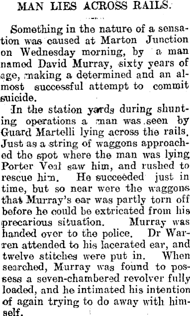 MAN LIES ACROSS RAILS. Something in the nature of a sensation was caused at Marton Junction on Wednesday morning, by a man named David Murray, sixty years of age, making a determined and an almost successful attempt to commit suicide. In the station yardg during shunting operations a man was .seen by Guard Martelli lying across the rails. Just as a string of waggons approached the spot where the man was lying Porter Veal saw him, and rushed to rescue him. He succeeded just in time, but so near were the waggons that Murray's ear was partly torn off before he oould be extricated from his precarious situation. Murray was handed over to the police. Dr Warren attended to his lacerated ear, and twelve stitchea were put in. When searched, Murray was found to possess a seven-chambered revolver fully loaded, and he intimated his intention of again trying to do away with himself.