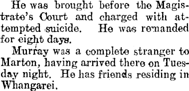 He was brought before the Magistrate's Oourt and charged with attempted suicide. He was remanded for eight days. Murray was a complete stranger to Marton, having arrived there on Tuesday night. He has friends residing in "VVhangarei.