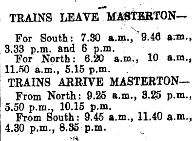 TRAINS LEAVE^Mi^TBRTON For South: 7.80 a.m., 9.46 am., 3.33 p.m. and 6 p.m. Tor North: 6.20 a.m., 10 a.m., 11.50 a.m., 5.15 p.m. TRAINS ARRIVE MASTERTONFrom North: 9.26 a.m., 3.25 p.m., 5.50 p.m., 10.15 p.m. From South: 9.45 a.m., 11.40 a.m., 4.30 p.m., 8.35 p.m.