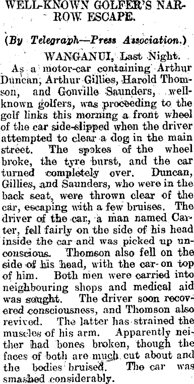 .WELL-KNOWN GOLFER'S NAR- ■ , ~ ROW ESCAPE, {By Telegraph—Press Association.) : ■■ \ WANiGANUI,'-Last .Night.', As a motor-car containing' Arthur .-Duncan; Arthur Gillies, Harold Thomson, and Gronv'ill© Saunders, wellknown golfers, wasl proceeding to the golf links this morning a front wheel of the car side-slipped when the driver attempted to clear a dog in the main street. The spakes of the wheel broke, the tyre burst, and the car turned completely over. Duncan, Gillies, and Saunders, who were in the back seat, were thrown clear of the car, escaping with a few bruises. The driver of the car., a man named Carter, fell fairly on the side of his head inside the car anil was picked up unconscious. Thomson also fell on the side of his head, with the car-on top of him. Both nien were carried into neighbouring shops and medical aid was sofqght. The driver soon recovered consciousness, and Thomson also revived. The latter has strained the mustta of his arm. Apparently neither had bones broken, though the faces of both are mucjjcut about and the bodies bruised. The car was .smashed considerably.