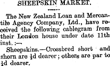 SHEEPSKIN MARKET. The New Zealand Loan and Mercantile Agency Company, Ltd., have received the following cablegram from their London house under date 11th inst.:—. Sheepskins.—Crossbred short and shorn are $d dearer; others are par to id dearer.