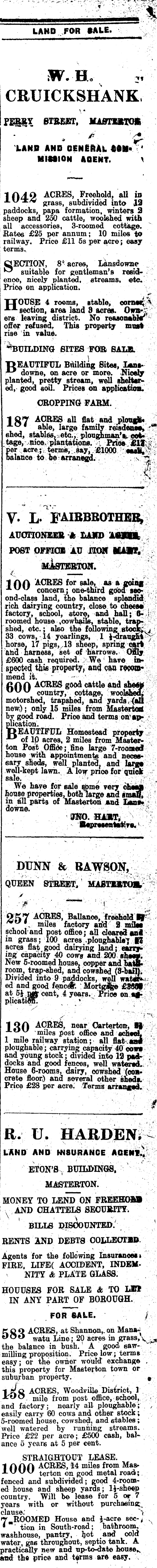 LAND FOR SALE. CRUICKSHANK, PERJ|Y BTBEDT, MAfITIKCOft LAND AND OENEIMfc, ••■•:?* MISSION 4QENT. | ftJO ACRES, Freehold, all in ±\J'±& grass, subdivided into 12 paddocks, papa formation, winters 2 sheep and 250 cattle, woolehed with all accessories, 3-roomed cottage. Rates £25 per annum; 10 miles to railway. Price £ll 5s per acre; easy terms.. *-* suitable for gentleman's enoe, nicely planted, streams, etc.' Price on application. section, area land 9 acres. Own< ere leaving district. No reasonable offer refused, This property mugt rise in value. SITES FOR SALE. downe, on acre or more. -Nicer/ planted, pretty stream, well sheltered, good soil. Priceß on application. CROPPING FARM. | QJ ACRES all flat and plougfc . iiJ ■ able, large family reisdeoM, ehed, stables, etc.. ploughmanVeot* toge, ..nice, piantaiione.': -i ;prtfcK#«fc per : acre;, terms, say, £IOOO :;«ii» Balance to be arranegd. v V." L. FAIBBROTHBI^f AuonoNiEiE * laud Awnm POST OFFICE AU HON MAWF. IA A ACRES for sale, as a goi , *vv concern; one-third goods, ond-class land, the balance splendid '' rich dairying country, close to chees* , factory, school, store, and hall; G-i roomed house .cowbaile, stable, trap- '■ - shed, etc.; also the foUowing stocky 33 cows, 14 yearlings, 1 horse. 17 pigs, ~13 sheep, spring -ai%'4 I*A«»«hANA ' Bflf *rf tIIAVVATVA '- i £6OO cash required. ■.; ;We ' have ■■m» -' spected. this property, and c&a r W©» j • mend it. '" ■ —"' ■.*■■."-"'■".',' ••■. •:-.',."";fi fiftft ACRES good cattle and -«—'-' vvrv country, cottage, woo! new,); only 15 miles from Mastertotf by good road. Price and terms on'application. :, ■-, :,■."'"•.•:'■' .v ; 'fe of ip acres, 2 miles from Masterton Post Office; fine large 7-roonted house with appointments and necessary sheds, well_ planted, and larfl* well-kept lawn. A low price for quick e nave for sale tome very < house properties, both large and si in all parts of Masterton *nd lont* downe. ■ umo. mmsi ■«pr*sralptiv«A BUNN & BAWSON, QUEEN" SmEET,' MABTiaTO* 2 P>7 ACRES, Ballanoe, IreehbM MV V miles factory arid 8 mikr school and post office; all cleared tnl in grass; 100 acres .ploughable? 13 acres flat good dairying land; winding capacity 40 cows and. 200 she J New 5-roomed house, copper and ha room, trap-shed, and cowshed (8-or Divided into 9 paddocks, well wa ed and good fencer. : Mortg at 5J n*cent, 4 years. Fnee on •§• 1 Oft ACRES, near Carterton, ■* xu " miles post office and self —• 1 mile railway station; all flat-: ploughable; carrying capacity 40 obwf and young stock; divided into 12 paddocks and good fences, well watered. House 6-rooms, dairy, cowshed (eo»crete floor) and several other sheds. Price £2B per acre.' Term? arranged. R. U. HARDENS LAND AND INSURANCE AGENT./ ETON'S. BUILWNQS. ' ; MASTERTON. HONEY TO LEND ON FREEEOM v AND CHATTELS SECURITY. BDLLS DISCOUNTED. i. RENTS AND DEBTS OOLLEOTID Agents for the following Insurances* FIRE. LIFE( ACCIDENT, INDEMNITY & PLATE GLASS. . HOUUSES FOR SALE & TO LBI IN ANY PART OF BOROUGH. FOR BALE. K Q O ACRES, at Shannon,, oh OO O watu Line; 29 acres in the balance in bush. A good sawmilling proposition. Price low ; terms easy; or the owner would' exchange , this property for Maeterton town or suburban property. ','"'.■-. lA& ACRES, Woodviile District, 1 *yo mile from post office, 8ch001,,. and factory; nearly all ploughable; , easily carry 60 cows and other stock; 5-roomed house, cowshed, and etables; well watered by running streams. Price'£22 per acre; £SOO cash, balance o years at 5 per cent. STRAIGHTOUT LEASE. . xj w terton on good metal road;. fenced and subdivided; good 4-roona-ed house and sheep yards; l£-sheep country. Will be lease for 5 or 7 years with or without clause: \ 1 ' tion in South-road; ,1 washhouse, pantry, hot and cold water, gas throughout, septio tank. A practically new and up-to-date house., and the price and terms are easy. V