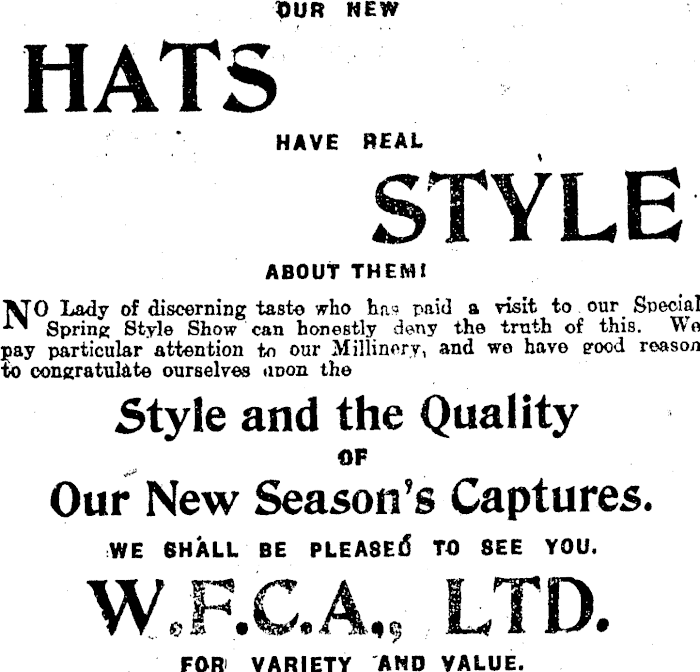 OUR NEW HATS HAVE REAL ABOUT THEMI rn laAv /»f dis/vn-TiiTicr tanto who hn<3 nn.i«] a visit to our Special 1 Spring Style Show can honestly deny the truth of this. We ]iay particular attention to our Millinery, and we have erood reason to congratulate ourselves tiDon the Style and the Quality OF Our New Season's Captures. WE 6HALL BE PLEABEG* TO BEE YOU. FOR' VARIETY AND VALUE.