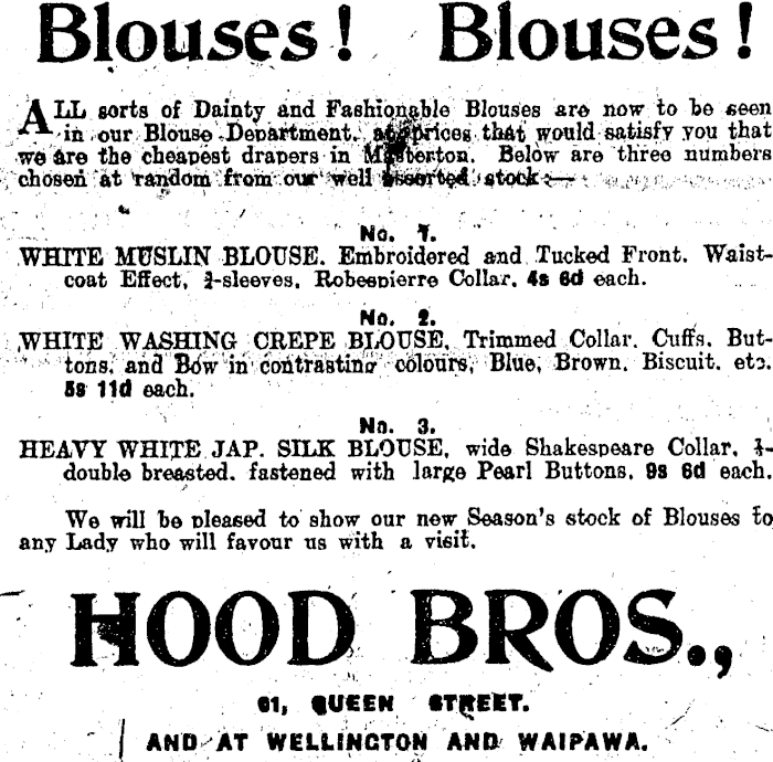 Blouses! Blouses! ALL sorts of Dainty and Fashionable Blouses are now to he *een „. . • in.our Blouse-DeDftrtment;. v Wonld satisfy you that we are the cheapest drapers in 'Waßroiston. Below are three numbers chosen *at * * ■•. ' ■'■ No. T. WHITE MtfSLIN BLOUSE. Embroidered and Tucked Front. Waist- . coat Effect, J-sleeves. Robeeoierre Collar. 4s 8d each. ' 'No. i. • , .WHITE WASHING CREPE BLOUSE, Trimmed Collar. Cuffs. But- '-* ' toils; and Bow "iri' ce^tmtinff'- Blue, Brown. Biscuit, eta. 88 11d each. Na. 3. HEAVY WHITE JAP. SILK BLOUSE, wide Shakespeare Collar, *- double breasted, fastened with large Pearl Buttons. 9s 6d each. We will he pleased to show our new Season's stock of Blouses to any Lady who will favour us with a vieit. HOOD BROS., •1, fUCEN tTJtfET. / I AND AT WELUNCTON AND WAIPAWA. ' . "'.
