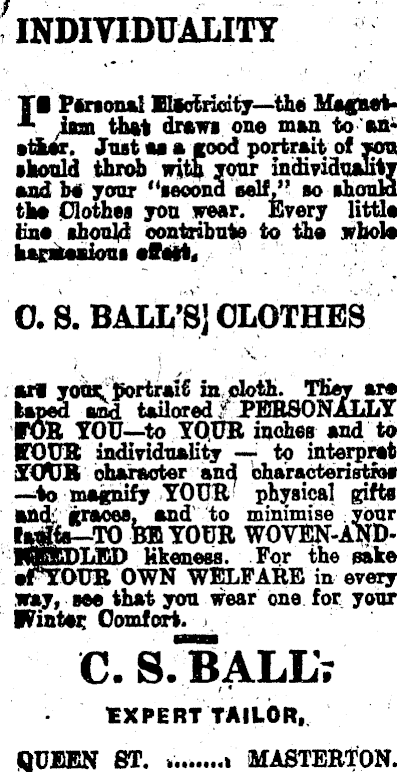 INDIVIDUALITY II Piraonai Ikotricrity—the IfagiM*ion that dittwi one man to an* •tiar. Just w • food portrait of Mot •■odd throb witi jour individuality •ad b# your "feoond self," bo should En* ihould oontnbute to the whole hapiaaioui effait, ■•'•* : O.S. BALL'S] CLOTHES to YOUR inches and to FOUR individuality to interpret XOtJB character and oharacteristroi magnify YOUR' physical gifts LED likeness. For the pake OUR OWN WELFARE in every way, see that you wear one for your •Viatic Comfort. > C. S. BALL; • EXPERT TAILOR. QUEEN ST. MASTERTON.