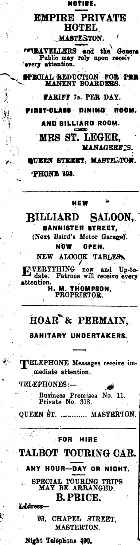 NOTICE. EMPIRE PRIVATE HOTEL MAOTEaTON. / and the Genera Public may relj upon reoeiv" '•wry Attention. ■PEOIAL REDUCfnON FOR Pl» MANENT BOARDERS. ffABIFF 7a. PER DAY. FIRST-CLASS DININO ROOM. AND BILLIARD ROOM. MRS ST. LEGER, MANAGERFTS. BjUXEN fiTKEVf, MASTExvTOJT. •PHiONI '498. BILIiIARD SALOON, BANNIBTER STREET, (Next Baird's Motor Garage). NOW OPEN. NEW ALOOOK TABLES* date. Patrons will receive every attention. , , H. M. THOMPSON, PROPRIETOR. HOAR & PERMAIN, SANITARY UNDERTAKERS. THELEPHONE Messages receive immediate attention. TELEPHONES:— Business Premises No. 11. Private No. 318. QUEEN ST. MASTERTON. FOR HIRE TALBOT TOURING CAR. ANY HOUR—DAY OR NIGHT. SPECIAL TOURING TRIPS MAY BE ARRANGED. B. PRICE. §3, CHAPEL STREET, MASTERTON. Nifnt Telephone 190.