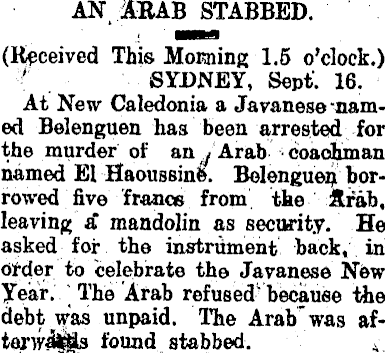 AN ARAB STABBED. (Received This Morning 1.5 o'clock.) ' SYDNEY, Sept. 16. At New Caledonia a Javanese "named Belenguen has been arrested for the murder of an j Arab coachman named El Haoussinfe. Belenguen borrowed five francs from, the ftrab, leaving a* mandolin as security. He asked for the instrument back, in older to celebrate the Javanese New Year. The Arab refused'because the debt was unpaid. The AraVwas aftetrwJfgs found stabbed. 4 v'