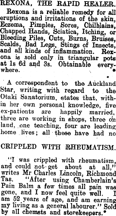 REXONA, THE RAPID HEALER. Rexona is a reliable remedy for all eruptions and irritations of the skin, Eczema, Pimples, Sores, Chilblains, Chapped Hands, Sciatica, Itching, or Bleeding Piles, Cuts, Burns, Bruises, Scalds, Bad Lege, Stings of Insects, and all kinds of inflammation. Rexona is sold only in triangular pots at Is 6d and 3s. Obtainable everyA correspondent to the Auckland Star, writing with regard to the Otaki Sanatorium, states that, within her own personal knowledge, five ex-patients are happily married, three are working in shopß, three oh land, one teaching, four are leading home lives; all these have had no CRIPPLED WITH RHEUMATISM. "I was crippled with rheumatism, and could mot-get about at all," writes Mr Charles Lincoln, Richmond Tas. "After using Chamberlain's Pain Balm a few times all pain was gone, and I now feel quite well. I am 52 years of age, and am earning my living as a general labourer." Sold by all chemsts and storekeepers.*