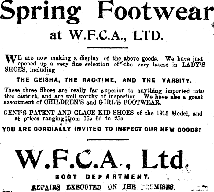 Spring Footwear at W.F.C.A., LTD. YXfE are now making a display of the above goods. We have just T T opened up a very fine selection of* the very latest in LADY'S SHOES, including THE GEISHA, THE RAG-TIME, AND THE VARSITY. These three Shoes are really far superior to any thins; imported into this district, and are well worthy of inspection. We hare also a great assortment of CHILDREN'S and GIRL'S FOOTWEAB. GENT'S PATENT AND GLAOE KID SHOES of the 1918 Model, and at prices ranging jjfrom 15s 6d to 255. W.F.C.A., Ltd BOOT DEPARTMENT. ; „ gEPAISS JBXEOCTEfi &N THE rSEJMft