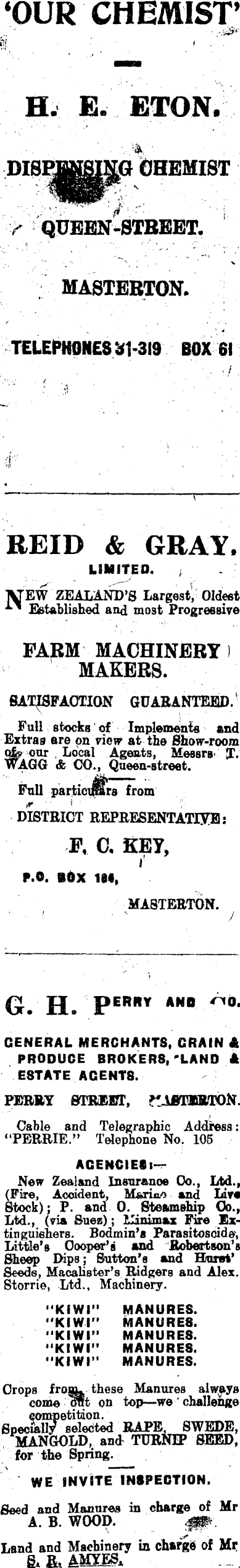 •OUR CHEMIST 1 BL E. ETON. G CHEMIST / QUEEN-STREET. MASTERTON. TELEPHONES BOX 61 REID & GRAY. LIMITED. Established and most Progressive FARM MACHINERY) MAKERS. SATISFACTION GUARANTEED.' Full stocks of Implements and Extras are on view at the Show-room ft our , Local Agents, Messrs' T. AGO & 00., Queen-street. DISTRICT REPRESENTATIVE: JV C, KEY, P.O. 10X 181, MABTERTON. G. H. P ERBY *«■ **• GENERAL MERCHANTS, GRAIN A PRODUCE BROKERB,'LAND A ESTATE AGENTS. PERRY STREET, Cable and Telegraphic Address: "PERRIE." Telephone No. 105 AGENCIES;— New Zealand Insurance Co., Ltd., (Fire, Accident, Marioo and Lire Stock); P. and 0. Steamship Co., Ltd., (via Suez); ilinimax Fire Extinguishers. Bodmin's Parasitoscide 1 , Little's Cooper's and Robertson's Sheep Dips; Sutton's and Buret' Seeds, Macalister'a Ridgers and Alex. Storrie, Ltd., Machinery. "KIWI" MANURES. "KIWI" MANUREB. "KIWI" MANUREB. "KIWI" MANURES. "KIWI" MANURES. Crops from.,these Manures always come ISt on top—we' challenge Speefoll/ selected RAPE, SWEDE, MANGOLD, an* TURNIP SEED, for the Spring. WE |NViTE~INtPEOTION. Seed and Manures in charge of Mr A. B. WOOD. <£■*. Land and Machinery in charge of Mr && AMIES*