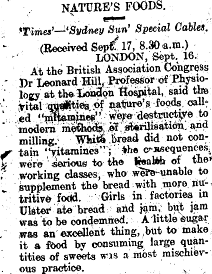 NATURE'S FOODS. "Times'— ''Sydney Sun' Special Cables. (Received ■ -' '■ LONDON, Sept. 16. At the British Association Congress * Dr Leonard HiiL Professor of Phyaio- " logy at the Lawkm Hospital, said the "-'■ Mtal nature's.foods, call: Y ed << m&ii«ie*" , were- destructive to " modemmshod|^ milling. 1 Whit* bread did not con- ■*■ tain "yitamincs"; :*he £■■ were serious to the IfcaW* of the* ," working classes, who weft»~unable to supplement the bread with more M- , tritive footf. Girls in factories in Ulster 1 ate bread: and jam,: but jam was to be condemned. A little sugar .- was an excellent thing, ,but to make it a food by consuming large quan- ■ tities of sweets was a most mischtev- J ous practice. v 1