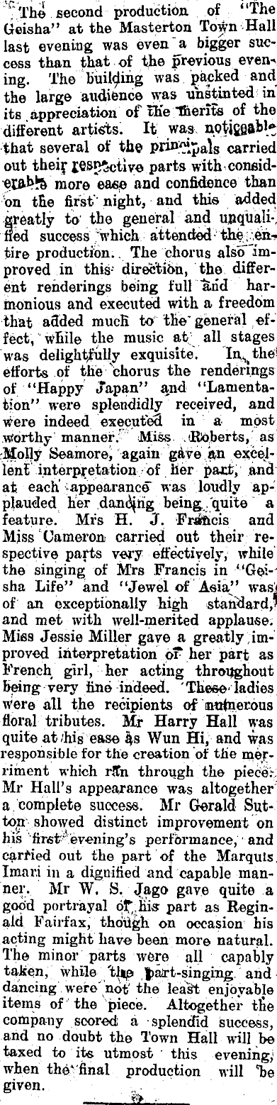 "'; Thesecond production of "The Geisha" at the Masterton Hall last evening was even "a bigger success than that of the previous ing. The building was packed and the large audience was unstinted in ! its appreciation of the TSierßs of the different artists. It was, notjfigabl* that several of the carried out tbeiy parts with coneideiabfe more ease and confidence than on the first' night, and this added greatly to the general and unquali-, led success !%hich attended • tire production.. The chorus also improved in this- - direction, the different renderings being fullarid har-: monious and executed with a freedom that added much to the" general effect, while the music at; all stages was delightfully exquisite. efforts of the "chorus the renderings of "Happy Japan" and "Lamentation" were splendidly received, and were indeed executed in a most wrdrthy' manner.' Miss .tßoberts,' as MoQf Seamorei again gave $n ©jccelleni interpretation of her pact, and at each' was loudly applauded her dantijrig being.quite a feature. Mrs H. J. Prsmcis and Miss Cameron carried out their respective parts very effectively, while the singing of Mrs Francis in "Gei-' sha Life" and "Jewel of Asia" was| of an exceptionally high standard* and met with well-merited applause., Mies Jessie Miller gave a greatly,improved interpretation p? her part as French girl, her acting throughout Being very fine indeed. ' Theso- ladies. were all the recipients of muinerdus floral tributes. Mr Harry Hall was quite at ;his ease $s Wun Hi, and was responsible for the creation of the merriment which ran through the piece"?;, Mr Hall's appearance was a complete success. Mr Gerald Sutton showed distinct improvement on his "nrefc*evening's performance, '■ and carried out the part of the Marquis. Imari in a dignified and capable manner. Mr W. S. Jago gave quite a good portrayal part as Reginald Fairfax, though on occasion his acting might have been more natural. The minor parts were all capably taken, while 'tl»p |)airt-singrng. and - dancing were" not' the leasJt enjoyable items of the piece. Altogether the company scored a splendid success, and no doubt the Town Hall will be taxed to its utmost ' this evening, l when therfinal production will *be given.
