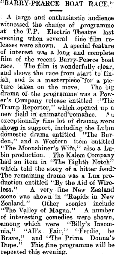 "BARRY-PEARCE BOAT RACE.'* A large and enthusiastic audience witnessed the change of programme at the T.P. Electrio Theatre last evening when several fine film releases were shoiwn. A special feature of interest wag a long and complete film of the recent Barry-Pearce boat race. The film is wonderfully clear, •and shows the race from start to' finish, and is a a picture< taken on the move. The big drama of the programme was a er's Company release entitled "The Tramp Reporter," which, .opened up a new field in animated%omahce. .* n exceptionally fine lot of dramas were shousp, in support, including the Lubiu domestic drama entitled "The Burden," and a Western item entitled "The Moonshiner'® Wife/' also a Lubin production. The Kalem Company had an item in "The Eighth Notch" which told the story of a bitter feud> The remaining drama was a Lux production entitled "By the Aid of Wireless." A very fine New Zealand scene was shown in "Rapids in New Zealand." Other scenics include "The Valley of Magna." A number of interesting comedies were shown, i among which were "Billy's Insomnia,;" "All's Fair," "Ferdie, be Brave,!' and "The Prima Donna's Dupe." This fine programme will be repeated this evening.