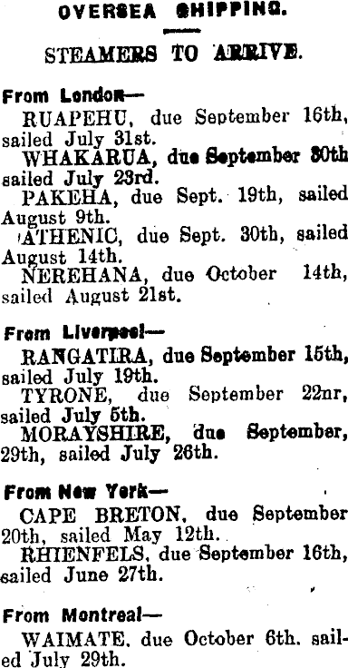 OVERSEA tHIPPINO. STEAMERS TO AMOVE. From Undo*— RUAPEHU, due September 16th, sailed July 31st. . WHAKARDA, due Sapttmbex 80th aailed July 23rd. PAKEHA, due Sept. 19th, sailed August 9th. ~ , (ATHENIO, due Sept. 30th, sailed August 14th. NEREHANA, due October 14th, sailed August 21st. From Llvtrpwl— RANGATIRA, due September 15th, sailed July 19th. TYRONE, due September 22nr, sailed July 6th. MORAYSHIRE, due September, 29th, sailed July 26th. From Ntw Ytrk— CAPE BRETON, due September. 20th, sailed May 12th. RHIENFELS, due September 16th, sailed June 27th. From Montreal— WAIMATE. due October 6th. sailed July 29th.