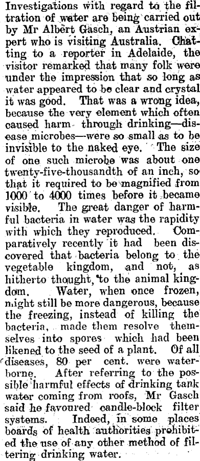 Investigations with regard ta the filtration of water are out by Mr Albert G&sch, an Austrian expert who is visiting Australia. Glutting to a reporter in Adelaide, the visitor remarked that many folk were under the impression that so long as water appeared to be clear and crystal it was gdod. That was a wrong idea, because the very element which often caused harm through drinking—disease microbes —were so small as to be invisible to the naked eye. The size of one such microbe was about one twenty-five-thousandth of an inch, so tlip,t it required to be>-magnified from 1000 to 4000 times before it .became visible. The great danger of harmful bacteria in water wag the rapidity with which they reproduced. Comparatively recently it had been discovered that bacteria belong to . the vegetable kingdom, and not, _ as hitherto thoiught,*to the animal kingdom. Water, when once frozen, might still be more dangerous, because the freezing, instead of killing the bacteria, made them resolve themselves into spores which had been likened, to the seed of a plant. Of all borne. After referring to the possibles'harmful effects of drinking tank water coming from roofs, Mr Gasch said he favoured candle-block filter systems. Indeed, In some .places boards of health autfeoritiea prohibited the use of any other method of filtering drinking water.
