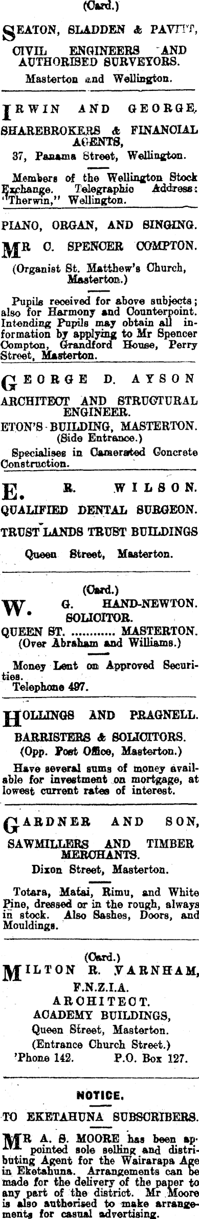 (Card.) g EATON, SLADDEN & PAVTIT, CIVIL ENGINEERS AND AUTHORISED SURVEYORS. Masterton and Wellington. JR WIN AND GEORGE, SHAREBROKERS & FINANCIAL AGENTS, 37, Panama Street, Wellington. Members of the Wellington Stock Exchange. Telegraphic Address: merrn," Wellington. PIANO, ORGAN, AND SINGING. JJR G. SPENCER CQMPTON. (Organist St. Matthew's Church, Masterton.) Pupils received for above subjects; also tor Harmony and Counterpoint. Intending Pupils may obtain au information by applying to Mr Spencer Oompton, Grandfora House, Perry Street, Masterton. Q.EOBGE D. AYSON ARCHITECT AND STRUCTURAL ENGINEER. ETON'S BUILDING, MASTERTON. (Side Entrance.) Specialises in Caraeroted Concrete Construction. B, WILS O N. QUALIFIED DENTAL SURGEON. TRUST'LANDS TRUST BUILDINGS Queen Street, Masterton. (ObkL) TIT G. HAND-NEWTON. TT ' SOLICITOR. QUEEN ST MASTERTON. (Over Abraham and Williams.) Money Lent oo Approved Securities. Telephone 497. ROLLINGS AND PRAGNELL. BARRISTERS A SOLICITORS. <Opp. Poet Offioe, Masterton.) Hare several sums of money available for investment on mortgage, at lowest current rates of interest. Q.ARDNER AND SON, SAWMILLERS AND TIMBER MERCHANTS. Dixon Street, Masterton. Totara, Matai, Rimu, and White Pine, dressed or in the rough, always in stock. Also Sashes, Doors, and Mouldings.' (Cfetd.) JJILTON R. VARNHAM, F.N.Z.I.A. ARCHITECT. ACADEMY BUILDINGS, Queen Street, Masterton. (Entrance Church Street.) 'Phone 142. P.O. Box 127. NOTICE. TO EKETAHUNA SUBSCRIBERS. Ttyfß A. S. MOORE lias been apXTA pointed sole BelKnp; and distributing Agent for the Wairarapa Age in Eketahuna. Arrangements can be made for the delivery of the pager to any part of the district. Mr Moore is also authorised to snake arrangements for casual advertising.