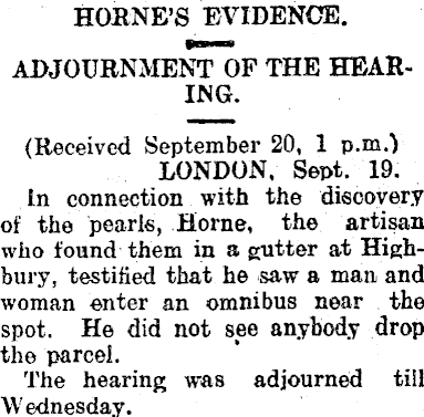 HORNE'S EVIDENCE. ADJOURNMENT OF THE HEARING. (Received September 20, 1 p.m.V LONDON, Sept. 19. In connection with the discoyery of the pearls, Home, the artisan who found them in a gutter at Highbury, testified that he saw a man and woman enter an omnibus near the spot. He did not see anybody drop the parcel. The hearing was adjourned till Wednesday.
