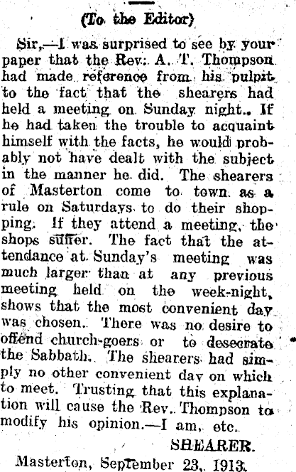 (To the Editor) Sir,.— l was. surprised to see bj. your' paper that the Rev: A. T. Thompson had made reference from. his. pulpit to the tact that the shearers had held a meeting, on. Sunday night.. If he had taken the trouble to acquaint himself with the facts, he would] probably not have dealt with the subject in the manner he. did. The shearers of Masterton come to town, as a rule on Saturdays, to do their shopping; If they attend a meeting, the 1 shops stJffer. The fact that the attendance at. Sunday's meeting was much larger- than at any previous meeting held on the week-night, shows that the most convenient day. was chosen. There was no desire to offend church'-goers; or to desecrate ' * the Sabbath,. The shearers- had simply no other convenient dav on which to meet. Trusting that this explanation will cause the Rev.. Thompson to modify hi« opinion.—l am, etc. SHEARER. Masterton, September 23,. 1913;