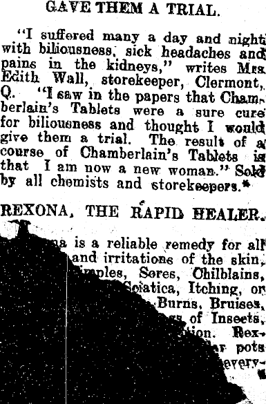 GATE THEM A TRIAL. •II 1 , B Jfff OTed many a day and nights with bUaousness. sick headaches and Rt w » he : *te*&*" writes Urn Edith Wall, storekeeper, Clermont, berlam's Tablets were a sure cure for biliousness and thought I wonM course of Chamberlain's Tablets is that lam now a new woman." SoW by all chemists and storekeepers * REXONA, THE RAPIB HEALER. is a reliable remedy for alf md irritatione of the Bkin* "~ les, Sores, Chilblains, fotica, Itching, ou *" Burns, ,of Inseets, " . Rex-. t pots very-