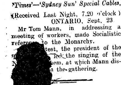 VlSmea'—-'Sydney Sun' Special Cables. Last Night, 7.20 o'clock ) ONTARIO. Sept. 23 Mr Tom Mann, in addressing a ' meeting of workers, made Socialistic ■e Monarchy, tlie president of the t&Lthe singing of the n, at which Mann disthe. gathering. rr' .'■■«■>—