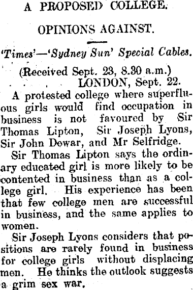 A PROPOSED COLLEGE. OPINIONS AGAINST. 'Times' — 'Sydney Sun' Special Cables. ' (Received Sept. 23, 8.30 a.m.) . . . LONDON, Sept. 22. A protested college where superfluous girls would find occupation in business is not favoured by Sir Thomas Lipton, Sir Joseph Lyons, Sir John Dewar, and Mr Selfridge. Sir Thomas Lipton says the ordinary educated girl is more likely to be contented in business than as a college girl. His experience has been that few college men are successful in business, and the same applies to women. Sir Joseph Lyons considers that positions are rarely found in business for college girls without displacing men. He thinks the outlook suggests a grim sex war.