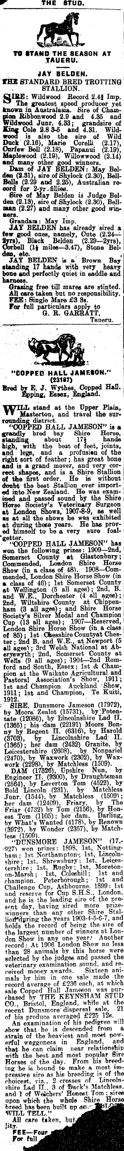 THE STUD. TO STAND THE BEA3ON AT TAUERU. JAY BELDEN. *H3 STANDARD BRED TROTTING STALLION. GIBE: Wildwood Record 2.43 Imp. *■* The greatest speed producer yet known in Australasia. Sire of Cham«'om Ribbonwood 2.9 and 4.35 and ildwood Junr. 4.33; grandsire of "" « Cole 2.8 8-6 and 4.31. Wild•d is also the sire of Wild Dock (2.16), Marie Oorelli (2.17), Curfew Bell (2.18), Papanui (2.19), Maplewood (2.19), Willowwood (2.14) and many other good winners. Dam of JAT BELDEN: May Belden (2.31), aire of Shylock (2.30), BellBejls (2.29 and 2.25), Australian record for 2-yr-fillies. Sire of May Belden is Judge Belden (2.13), sire of Shylock (2.30), Bellaum (2.27) and many other good wmners. Grandam: May Imp. JAT BELDEN has already sired a few good ones, namely, Oute tyre), Black Belden (2.29—2yr5), Oorbell (1* miles—3.47), Stone Belden, eto. , JAY BELDEN is a Brown. Bay standing 17 hands with very heavy bone ma perfectly quiet in saddle ana harness. Gracing free till mares are stinted. All care taken but no responsibility. FEE: Single Mare £3 3s. For foil particulars apply to G. R. GAKRATT, Taneru. "COPPED HALL JAMESON." (23187) Bred by E. J. Wythes. Copped HaD. Epping, Esses, England. 117 ILL stand at the Upper Plain, " Masterton, and travel the sur- i rounding district. ' ED HALL JAMESON" is a grandly bred bay Shire Horse, standing about 17f hands high, with the best of feet, joints, and lege, and a profusion of the right sort of feather; has great bono and is a grand mover, and very correct shapes, and is a Shire Stallion of the first order. He is without doubt the best Stallion ever imported into New Zealand. He was exam- ( Horse Society's Veterinary Surgeon j at London Shows; 1907-8-9, as well •a at all the shows he was exhibited at during these years. He has proved himself to be a very sure foal*getter. "COPPED HALL JAMESON" has won the following prizes: 1909—2nd, Somerset County at Glastonbury; Commended, London Shire Horse Show (in a class of 48). 1908—Commended, London Shire Horse Show (in a class of 46); Ist Somerset County at Wellington (5 all ages); 2nd, B. and W.E., Dorchester (4 all ages);. 2nd, Wiltshire County at Chippenham (3 all ages): and Shire Horse Cup (13 all ages); 1907—Reserved, London Shire Horse Show (ih r a class of 85) j Ist i Chesshire Countya't Chester; 2nd B. and W.E., at Newport (5 all ages>; 3rd Welsh National at Aberyewyth; 2nd, Somerset County at Wells (9 all ages); 1904—2nd Romford and South, Essex; Ist & Chamfion at the Waikato Agricultural and •astoral Association's Show, 1911; Ist and Champion Auckland /Show, 1911; Ist and Champion, Te Kuiti, 1912. SIRE, Dunsmore Jameson (17972), by Moors Zealot (15731)* by 'Potentate (12086), by Lincolnshire Lad 11. (1365); his dam (22191) Moors Bonny by. Regent 11. (6316 V, by Harold (3703), by Lincolnshire Lad* n. (1365); her dam (2432) Granite, by Leicestershire (2608), by Nonpariel (2470), by Waxwork (2302), by Waxwork (2298.V by Matchless (1509). .. DAM (17526), Upshir.6 Nun, by Engineer TL (9300), by Draughtsman (2664), by Leverton Tom (4522), by Bold Lincoln (231), by MatchleSß Junr. (1544), by Matchless (1509); her dam (12409), Friary, by The ■Friar (4732) by T0m.(2156), by Honest Tom (1105); her dam, Darling, bv What's Wanted (4178\ by Renown (3972), by Wonder (2357), by Match'eS"DUNSMORE JAMESON" (17,HJ27> won prizes: 1898, Ist, Nottingham; Ist.Northampton-; lst» Lincolnshire; Ist, Shrewsbury: l6t, Leices-' tershire; Ist, Rugby, Ist, Moreton-on-Marsh; • Ist, Coleshill; Ist and champion, Peterborough; - Ist and Challenge Cup, Ashbourne. 1899: Ist and reserve for Cup S.H.S., London, and he is the leading eire of the present day, having sired more prizewinners than any other Shire Stalliorttinring the years 1903-4-5-6-7, and holds the record of being the sire of the largest number of winners at London Show in any one year.» Another record: At 1906 London Show no less than 28 animals by this horse were selected by the judges and passed the veterinary examination sound, and received money awards. Sixteen animals by him in one sale made the record average of £236 each, at which sale Copped Hall Jameson was purchased bv THE KEYNSHAM STUD CO., Bristol, England, while at the recent Dunsmore' dispersal sale, 21 of his produce averaged £225 12s. An examination of his pedigree will -show that he is descended from a .strain of the heaviest and most powerful waggoners in England, and that he can claim near relationship with the best and most popular Sire Horses of the day. From his breeding be ie bound to make a most impressive sire as hie breeding is of the choicest, viz., 2 crosses of Lincolnshire Lad IT., 3 of Back's Matchless, and 1 of Weichers' Honest Tom ; sires upon which the whole Shire_ Horse breed has been built up anr '" " WILL TELL." AH care taken, but' Jity. . " FEE—Four for foil '