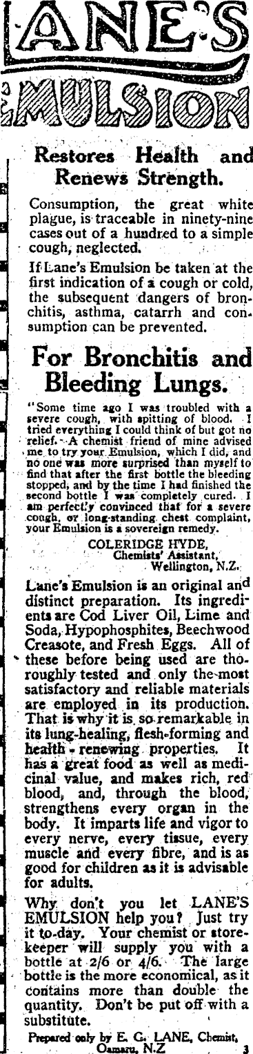 fsits rsk'. Ymw. m?m Restores Health and Renews Strength. Consumption, the great white plague, is traceable in ninety-nine cases out of a hundred to a simple cough, neglected. If Lane's Emulsion be taken at the first indication of a cough or cold, the subsequent dangers of bronchitis, asthma, catarrh and consumption can be prevented. For Bronchitis and Bleeding Lungs. "Some time ago I was troubled with a severe cough, with spitting of blood. I tried everything I could think of but got no • relief.- A chemist friend of mine advised > me. to try your. Emulsion, which I did; and no one was more surprised than myself to find that after the first bottle the bleeding stopped, and by the time I had finished the second bottle I was' completely cured. . I am perfect'/ convinced that for a severe cough, o?. long-standing, chest complaint, your Emulsion is a sovereign remedy. COLERIDGE HYDE. 1 Chemists' Assistant, Wellington, N.Z. Lane's Emulsion is an original an d distinct preparation. Its ingredients are Cod Liver Oil, Lime and Soda, Hypophosphites, Beechwood Creasote, and Fresh Eggs. All of • these before being used are thoroughly tested and only the-mott satisfactory and reliable materials are employed in its production. That is why it is. so;remarkable in its lung-healing, flesh-forming and health - renewing properties. It Has a great food as well as medicinal value, and makes rich, red blood, and, through the blood, strengthens every organ in the body. It imparts life and vigor to every nerve, every tissue, every muscle arid every fibre, and is as good for children as it is advisable for adults. Why don't you let LANE'S EMULSION help your Just try it to-day. Your chemist or storekeeper will supply you with a bottle at 2/6 6r 4/6. The large bottle is the more economical, as it Contains more than double the quantity. Don't be put off with a substitute. ■•.'•"' Prepared only by E. G. LANE, Chemnt, CUmaro, N.Z 3