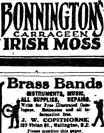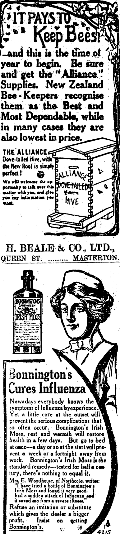 l~and this it the time oi year to begin. Be sure [ffi»Tn«r.Tlsft;iiro Supplies. New Zealand Bee -Keeper* recognise them «* the- Best and Jißnl •"W..T..Rfl'nsW fRJ in many cases they are also lowest in price. THE ALLIANCEe Dwe-UiledHivi, Willi the New Roof is simply perfed! W« «r)0 w*lcmm ifc* opponmlt; to UM «*r «Ms ■Miter •HhjHM, M4«itt yw tar Whbmlm rw •Ml H. BBALB & CO, LTD., QUEEN ST. MAfiTERTON. E ■sr B $ Bennington s Cures Influenza Nowadays everybody knows the symptoms of Influenza fey experience] Yet a little care at the outset will , prevent the serious complications that ', so often occur. Bonnington's Irish Moss, rest and warmth will restore health in * few days. Bet go to bed atosce—a day or so atthe start will prevent a week or a fortnight away from work. Bonnington's Irish Moss is the standard remedy—tested for half • ct» tury, there's nothing to equal it. Mrs. E. Woodhouie, of Nortbcole, writs*! "I have tried a bottle of BonniottM't Irish Mom and fouad it very fwd. I hid a Hidden attack of laflueaxa fi it »a*ed me from a itv.t. ilkata," Refuse an imitation or substitute which gives the dealer a bigger J profit. Insist an getting Bonnington's. ... fffl