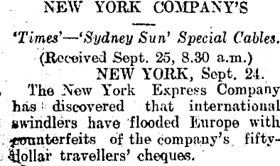 NEW YORK COMPANY'S 'Times' —'Sydney Sun' Special Cables. (Received Sept. 25, 8.30 a.m.) NEW YORK, Sept. 24. 1, The New York Express Company has 1 discovered that international ' swindlers have flooded Europe with . of the company's, fiftyj Ijollar travellers' cheques.
