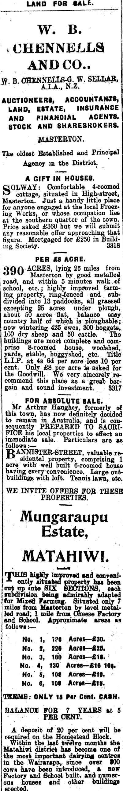LAND FOR tALi. W. B. ; vC-HENNBLLa AND CO.. W B. OHENNfillfi-O. W. SEH4& 1 A.1.A., N.Z, AUCTIONEER!, ACCOUNTANTS, LAND, ESTATE, INSURANCE AND FINANCIAL AGENTS. BTOCK AND SHAREBROKERS. MASTERTON. The oldest Established and Principal Agency in. the District. A GIFT IN HOUSES. 1 cottage, situated in High-street, Masterton. Just a handy little place for anyone engaged at the local Frees* ing Works, or whose occupation lies at the southern quarter of the town. Price asked £360 but we will submit any reasonable offer approaching that figure. Mortgaged for £250 in Build- , ing Society. 3318 1 PER £8 ACRE. < ' Masterton by good metalled road, and within 5 minutes walk of school, etc.; highly implored farm" ing property, ring-fenced and subdivided into 13 paddocks, all grassed excepting 25 acres under plough, about 50 acres flat, balance easy country half of wbiph is ploughable; mow wintering 425 ewes, 800 hoggets, 100 dry sheep and 50 cattle. The buildings are most complete and comprise 8-roomed house, woolshed, yards, stable, buggyshed, etc. Title L.I.P. at 4s 6ti per acre less 10 per cent. Only £8 per acre is asked for the Goodwill. We very sincerely commend this place as a great bargain and sound investment. 3317 FOR ABSOLUTE SALE. Mr Arthur Haughey, formerly of this town, has now definitely decided to remain in Australia, and is consequently PREPARED TO SACRIFICE his local properties to effect an immediate sale. Particulars are as follows: valuable re- ■*-* sidental property, comprising 1 having every convenience. Large outbuildings with loft. Tennis lawn, etc. WE INVITE OFFERS FOR THESE PROPERTIES. Mungaraupu Estate, MATAHIWL ! subdivision beinfl admirabhr adanted for Mixed Farming. Situa miles from Masterton by level metalled road; 1 mile from Cheese Factory and School. Approximate areas as follows: j No. 1, t?o Acres—£3o. ' No. 2, 228 Aoret—£2B. No. 3, 160 Acres—£ll. No. 4, 130 Acres—£l6 101. No. 5, lot Acres—£l9. No. 6, 101 Acres—£ll. TERMS: ONLY II For Cent. CASH. BALANOH FOR 7 YEARS at 5 . PER GENT. ■;■•■ ■ will be in the last twelve months the Matahiwi district has become one of the most important dairying centres in the Waixarapa, since over 100 cows have been introduced, a new Factory and School built, and numerous houses and other buildings erected.