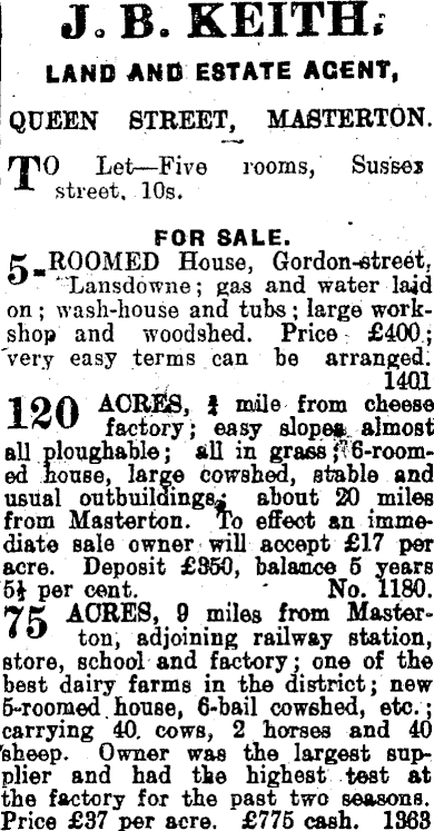 J a B. KEITH. LAND AND EBTATE AGENT, QUEEN STREET, MASTERTON. HpO Let—Five rooms, Sussex •*• street. 10s. ! FOR SALE. K .ROOMED House, Gordon-street, .** ' Xansdowne; gas and water laid on; wash-house and tubs; large workshop and woodshed. Price : £400.; 'very easy terms can be arranged: ' if ' ' 1401 ' v factory; easy slope*, almost jlpughable; all in grass £ 6-room-!ed house, large cowshed, stable and usual about 20 miles from Master ton. To effect an immediate sale owner will accept £l7 per acre. Deposit £950, balance 5 years 5* per cent. - No. 1180. JK ACRES, 9 miles from Master- •** ton, adjoining railway station, store, school and factory: one of the 5-roomed. house, 6-bail cowshed, etc.; carrying 40. cows, 2 horses and 40 'sheep. Owner was the largest supplier and had the highest test at; the factory for the past two seasons. Price £37 per acre. £775 cash. 1563