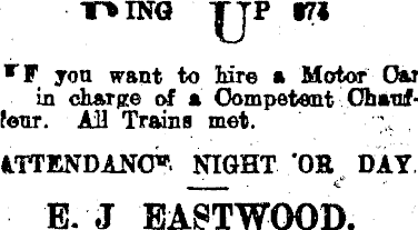 T»ING F 171 r F joa want to Lire a Motor Oar in charge of a Competent Chauffeur. AH Trains met. ;„ iTTENDANO». NIGHT OB DAY E. J EASTWOOD.