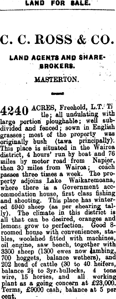 LAND FOR MLE. C. C.ROSS & CO. LAND AGENTS AND SHAREBROKERS. MASTERTON. " tie; all undulatin 9 jwrtion pkraghable; well subdivided and fenced; sown in English grasses; most of the property was originally bush (tawa principally)'. This place is situated in the Wairoa district, 4 hours' run by boat and 76 miles by motor road from Napier, then 30 miles from Wairoa; coach passes three times a week. The property adjoins Lake Waikaremoana, where there is a Government accommodation house, first class fishing and shooting. This place has wintered 5940 sheep (as per shearings tally). The climate in this dietnot is all tha,t can be desired, oranges and lemons grow to perfection, wood 8roomed house with conveniences, stables, wookhedi fitted with machines, oil engine, saw bench, together with 3300 sheep (1300 ewes now Jambing, 700 hoggets, balance wethers), and 202 head of cattle (30 to 40. heifers, balance 2% to 3yr. bullocks, 4 tons wire, 15 horses, and all working plant as a going concern at £23,000. Terms, £9OOO cash, balance at 5 per cent.