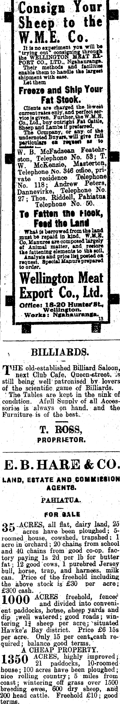 Sheep to tKc W.M.TE. Co. »i&^rai^si. Their methods "»<* l**" 1 "? enable them to handle the largest chipment with ease. Let them Freeza and Ship Your Fa! Stook. Clients are charged the idlest omTentTates only, and perfect serkltfjwftwfcmin Sheep and Lambs if pre! The Company, or any, of th* nnderaotedßuyeis,wilT|iw *»" particulars •» 'mtwi'-w '*• W McKenzie, Mtwerton, Telephone JNo. 846 wfice, private residence Telephone ; No. 118; Andrew . Peterß, Dannevirke, Telephone No. Telephone No. 50. Ta Fattan tn§ iieaK, FaadthaLani What is Urrowedfromtheland must bo repaid In Jrirt<"g& €o. Manures are composed largely •f Animal matter, and. restore the fattening elements to th* soil. Analysis and price list posted «} request. Special Mannriprepared to order. Wellington Meat Export Co.. Ltd. Of fleet 18-20 Hunter St. Wellington. Works: N*idiaur*n«*. BILLIAKDS. next Club Cafe, Queen-etreet, is still being well" patronised by lovers of the scientific, game of Billiards. " The Tables are kept in the rank of condition. Afnil Supply of all Accessories is always on hand, and the Furaitureis of the best.. t; boss, PROPRIETOR. E.B.HARE&CO. LAND, ESTATE AND COMKIMION ACENTO. PAEttATUA. FOR BALE 3p' ACRES, all flat, dairy land, 25 ".. acres have been ploughed; 5roomed house, cowshed, trapshed; 1 acre in orchard; 20 chains from school and 40 chains from good co-op. factory paying Is 2d, per lb for butter fat:; 12 good cows, 1 purebred Jersey bull, horse, trap, and harness, milk can. Price of the freehold including the above stock is £3O per acre; £3oocash. / and divided into convenient paddocks, house, sheep yards and dip jwell watered; good roads; winHawke'e Bay district. Price £6 15s per acre. Only 15 per cent % cash required; balance good terms.' A CHEAP PROPERTY. wv 21 paddocks, 10-roomed-house; 100 acres have been ploughed; nice rolling country; 5 miles from coast; wintering off grass over 1500 breeding ewes, 600 dry sheep, and 200 head cattle. Freehold £10; good terras.