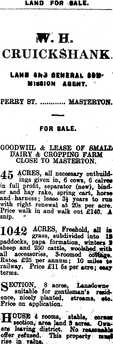 LAND FOR SALE. M. H. CRUICK&HANK LANB «M tCNKIIAk lII' MItfSION A SENT. ' PERRY ST MASTERTON. FOR SALE. GOODWIIL & LEASE OF SMALL DAIRY & CROPPING FARM CLOSE TO MASTERTON. 45 ACRES, all necessaiy outbuild- " ings given in, 6 cows, 6 calve* m full profit, separator (new), binder and hay rake, spring cart, horse and i harness; lease 3} years to ran with right renewal, at 20s per acre. Price walk in and walk out £l4O. A snip. * 1042 ACRES, Freehold, til » grass, subdivided into IB paddocks, papa formation, winters 9 sheep and 250 cattle, woal&hed with all accessories, 3-roomed col&g*. Rates £25 per annum; 10 miles to railway. Price £ll 6s per aero; easy terms. QEOTION,, 8 aores, Lansdowne suitable for gentleman's residence, nioely planted, streams, «io. Price on application. XIO USE 4 rooms, stable, oorMC seotaon, area land 8 aero. Own> era leaving district. No reaseoatta offer jefused. This property bnnl rise in vafoa* . ,i'.