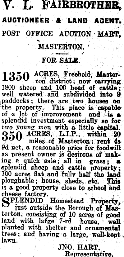 V. l. faibbbothbb* AUCTIONEER A LAND AGENT. POST OFFICE AUCTION MART, MASTERTON. ' FOR SALE. 1 AC W S > Freehold, Masterton district: now carrying 1800 sheep and_loo head of cattle; well watered and subdivided into 9 paddocks; there are two houses on the property. This place is capable of a lot of .improvement and -ie • splendid investment especially so for two young men with a little capital. QKA ACRES, LIP., within 20 ymiles of Masterton : rent 4s 9d set, a reasonable price for food will as present owner is desirous of making a quick sale; all in grasß; » splendid sheep and cattle property; 100 acres flat and fully half the land ploughable; house, sheds, etc. This is a good property close to school and cheese factory- * » • CJ P LEND ID Homestead Property, just outside the Borough of Masterton, consisting of 10 acres of good land with lafge 7-rd house, well planted with shelter and ornamental trees; and having a large, well-kept x lawn. JNO. HART, Representative.