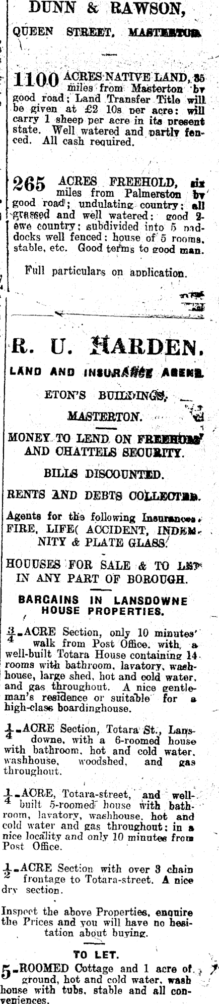 DUNN & KAWSGN, QUEEN STREET, MASTBKIfOBk Y*„ ■" • J. 1 1 OH ACRES NATIVE LAND,. 85 miles from Maisterton br good road; Land Transfer Title will < be-.'given.- at £2 10s ner acre: will carry 1 sheep per acre in its present state. Well watered and parti? fenced. All cash reauired. 2 ACRES FREEHOLD, us miles from Palmereton br . good road l ; undulating country; all and well watered: good 2ewe country; subdivided into 5 niddocks well fenced : house of 5 rooms, stable, etc. Good teAns to erood man. Full particular® on application. r. u. Harden. LAND AND >BEN& ETON'S BUILfrlN^.. masterton. • MONET TO LEND. ON FBJEUEHCbISf AND CHATTELS SEODBITY. BILLS DISCOUNTED. RENTS AND DEBTS OOtLEOTMB. Agents for the following InsnnuKwa* FIRE, LIFEC ACCIDENT, INDKM*NITY & PLATE GLASS/ HOUDSES FOR SALE & TO LB> IN ANY PART OF BOROUGH. BARGAINS IN LANSDOWNE , HOUSE PROPERTIES. -ACRE Section, only 10 minutes' walk from Post Office, with, a well-built Totara House containing 14rooms with bathroom, lavatory, waehhouse, large shed, hot and cold water, and ga« throughout. A nice gentleman's residence or suitable for a high-class boardinghouse. i .ACRE Section, Totara St., Laqsdowne, with a 6-roomed house with bathroom, hot and cold water, washhouse, woodshed, and gas throughout. J. .ACRE, Totara-street, and well--4 built 5-roomed" house with bathroom, lavatory, ivashhouse. hot and cold water and gas throughout: in a nice locality and only 10 minutee from Post Office. X.ACRE Sect ion with over 8 chain A frontage to Totara-street. A nice dry section. Inspect the above Properties, enquire the Prices and you will have no hesitation about buying. TO LET. K-ROOMED Cottage and 1 acre of. - f ground, hot and cold water, wash house with tubs, stable and all conveniences.