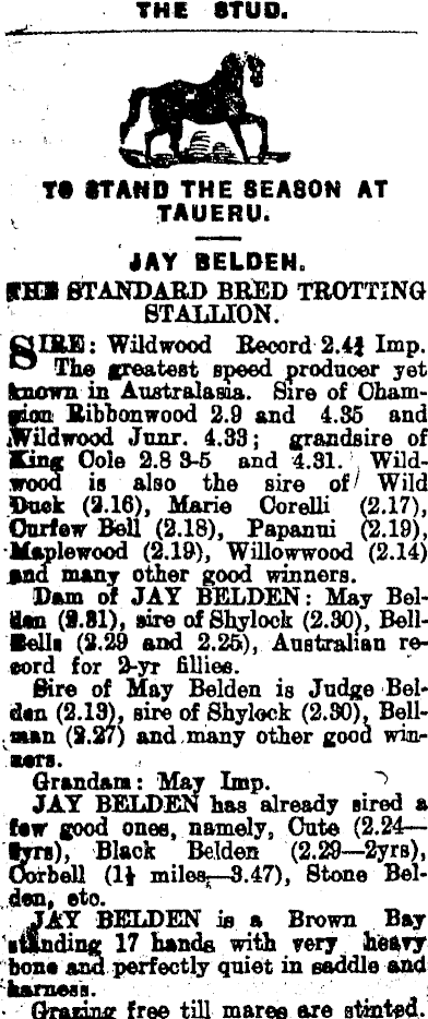 THE STUD. — T§ STAND THE SEASON AT t taueru. JAY BELDEN. WE* STANDARD BRED TROTTING STALLION. QtEE: Wild wood Record 2.4f Imp. " The greatest speed producer jet known in Australasia, rare of Ohammm Ribbonwood 2.9 and 4.85 and iWildwood Jtuir. 4.39; grandsire of Xing Oole 2.8 3-5 and 4.81.' Wildwood is also the sire ot> Wild Boek (3.16), Marie Oorelli (2.17), Curfew Bell (2.18), Papanui (2.19), -Msplewood (2.19), Willowwood (2.14) sad many other good winners. Dam of JAY BELDEN: May BelHan (9.81), we ofShylock (2.30), Bell■elli (2.29 and 2.25), Australian record for 2-yr filliee. Sire of May Belden is Judge Bel' dsn (2.13), sire of Shyleck (2.30). BellMn (8.27) and . many other good winMrs. Grandam: May Imo. JAT BELDEN has already sired a tew good onee, namely, Gate (2.24 Ryrs), Black Belden (2.29-2yrs), Oorbell (1J miles-—3.47), Stone Bel- , d«n, eto. JAY BELDEN is a Brown Bay standing 17 hands with ?ery heary boneand perfectly quiet in saddle and harness. ■ i • Gnuring free till maree are stinted.