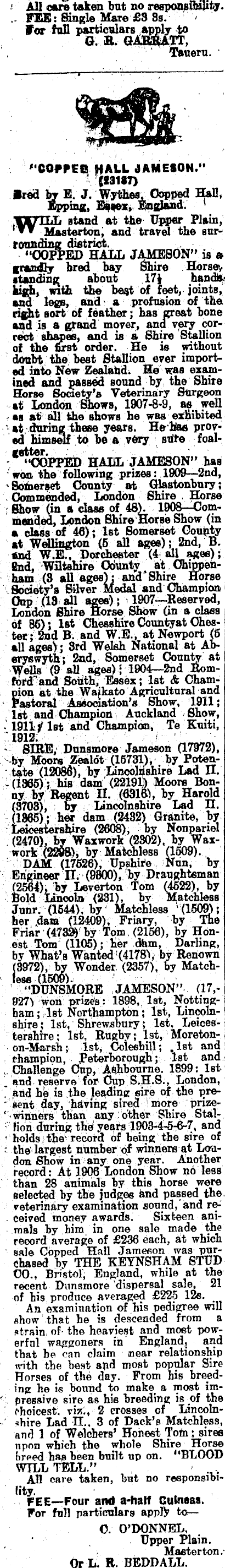 All care taken but no responsibility. FEE: Single Mare £3 3g. Wot foil p^icalanr Taueru. "COPPED HALL JAMESON." 1 (831 iT) ■red by E. J. Wythes, (topped Hall, Bppm*, E#*>x, England. ' WMTJMj stand at the Upper Plain, " Maaterton, and travel the sttrrounding district. "OOPPED HALL JAMESON" is » grandly bred bay Shire Horsev standing about 17J handfe.high, with the best of feet, joints, and legs, and a profusion of the right Bort of feather; has great bone and is a grand mover, ana very correct shapes, and is a Shire Stallion of the first order. He is without doubt; the'best Stallion ever imported info New Zealabd. He was examined and passed sound by the Shire Horse Society's Veterinary Surgeon at London Shows, 1907-8-9, as well - as at all the shows he was exhibited at, during these years. Heltos proved himself to be A v&ry stite foal- * HALL JAMESON" has woo the following prizes: 1909—2nd, "Somerset County at Glastonbury; Commended, London Shire . Horse ' Show (in a class of 48). 1908—Commended, London Shire Horse Show (in a class of 46); let Somerset County at Wellington (5 all ages); 2nd, B. and W.E., Dorchester (4 all agee); End, 'Wiltshire County at. Chippetaham (3 all ages); and' Shire Horse Society's Silver Medal and Champion Cup (19 all agee) ; ; 1907—Reserved, London Shire Horse Show (in a class of 86); Ist ChesshiTe Coulityat Chester; 2nd B. and W.E., at Newport (5 all ages) ; 3rd Welsh National at Aberyswyth; 2nd, Sotrierset County at Wells (9 all ages); 1904—2nd Romford'andSoUth, Essex; Ist & Chamfion at the Wajkato Agricultural and 'aßtoral Association's Show, 1911; Ist and Champion Auckland 'Show, 1911 Ist aid Champion, Te Kuiti, 1912. ' !'■: /■-. SIRE, Dunsmore Jameson (17972), -by Moors Zealot (15731), . by Potentate (12086), by Lincolnshire Lad 11. (1365) ; hiß dam (22191# Moons Bonny by Recent 11. ;(6916), by Harold (3703), by Lincolnshire Lad H. (1865); her dam (2432) Granite, by Leicestershire (2608), by Nonpanel (2470), by Waxwork (2302), by Waxwork (2»a), by Matchless (1509). , DAM (17526), 'Upshift Nnn, by Engineer 11, (9800), by Draughtsman (2w4), by Leverton Tom (4622), by Bold LLaooln (231), by Matchless Junr. (1544), by Matchless v (1509); her .dam (12409); Friary, by The Friar (4733*' by Tom, (2156), by Honest Tom (1105); Ker <tem, Darling, by What's Wanted (4178), by Renown Wonder. (2357), by Match--027 V won prizes: 1898, Ist, Nottingham ; .Ist Northampton; Ist, Lincolnshire; Ist, Shrewsbury; Ist, Leicestershire; Ist, Rugby; Ist, Moreton-on-Marsh; Ist, Coleebill; .Ist and thampion, Peterborough; Ist and Challenge Cup, Ashbourne. 1899: Ist and reserve for Cup S.H.S., London, arid hie is the leading sire of the present day, hdvmg sired more prize- • winners than any other Shire StalHon during the years 1903-4-5-6-7, and holds the* record of being the sire of the'largest number of winners at Loadon Show in any one year. Another record: At 1906 London Show n6 less than 28 animals by this horse were selected by the judges fend passed the. veterinary examination sound, and received money awards. Sixteen animals by him in one sale made the record average of £236 each, alt which sale Copped Hall Jameson was purchased by THE KEYNSHAM STUD CO., Bristol'; England, while at the recent Dunsmore dispersal sale, 21 of his produce averaged £225 12s. An examination of his pedigree will show that he is descended from a strain, of- the heaviest and most powerful waggoners in England, and that be can claim near relationship trith the best apd most popular Sire Horses of the day. From his breeding he is bound to make t a most impressive sire as hie breeding is of the choicest, viz., 2 crosses of Lincolnshire Lad 11.. 3 of Dack's Matchless, ami 1 of Welches' Honest Tofn: sires upon which the whole Shire Horse breed has been built up on. "BLOOD WILL TELL." ' . All care taken, but no responsibility. FEE—Four and a-half Guineas. For full particulars apply to— O. O'DONNEL, . Upper Plain. Master ton.Or L. R. BEDDALL.