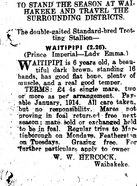 TO STAND THE SEASON AT W AlHAKEKE AND TRAVEL THE SURROUNDING DISTRICTS. 'The double-szaited Standard-bred Trotting Stallion—"s" WAITIPIPI 12.26). (Prince Imperial—Ladv Emma.') ISJIfAITIPIPI is 6 years old, a beau- ** tiful dark brown, standing 16 hands, has good flat bone, plenty of muscle, and a real eppd temper. TERMS: £4 4s eineie mare, two or' more as pei* arrangement. Payable January, 1914. All care taken, "but no responsibility. Mares not proving: in foal retarded free next season; mate sold or exchanged held to be in foal. Regular trips to Mnr* traborongh on Mondays. Feathers! on Tuesdays. Grazing free. For further particulars apply to owner ■W, W. HERCOCK. , . Waibakeke.