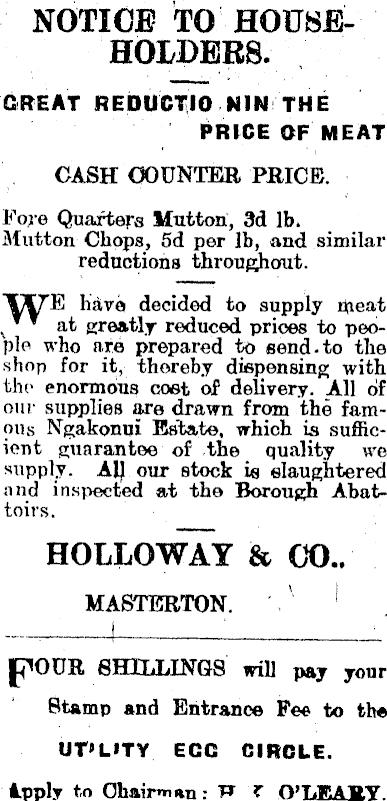 NOTICE TO HOUSEHOLDERS. GREAT REDUCTIO NIN THE PRICE OF MEAT CASH COUNTER PRICE. Fore Quarters Mutton, 3d lb. Mutton Chops, 5d per lb, and similar reductions throughout. have decided to supply meat v * * at greatly reduced prices to people who are prepared to send-to the shop for it, thereby dispensing with the enormous cost of delivery. All of our supplies are drawn from the famous Ngakonui Estate, which is sufficient guarantee of the quality we supply. All our stock is slaughtered and inspected at the Borough Abattoirs. HOLLOWAY & CO.. MASTERTON. ' 1 p'OUR SELLINGS will pay your Stamp and Entrance Pee to th« UT'LITY ECC CIRCLE. Ipply to Chairman: TT T O'LEAHY.