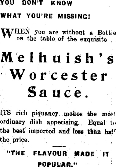 YOU DON'T KNOW WHAT YOU'RE MISSING! TM7"HEN you are without a Bottle oh the table of the exquisite Me Ih u i sh's W or cester Sauce. ITS rich piquancy makes the mdf' ordinary dish appetising.. Equal to the best imported aoid less than h*] r the price. "THE FLAVOUR MADE IT POPULAR."