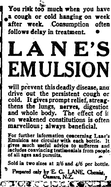 You riik too much whea you have # a cough or cold hanging; on week after week. Consumption often follow* delay in treatment • LANE'S EMULSION will prevent this deadly disease, aria drive out the persistent cough or cold. It gives prompt relief, strengthens the lungs, nerves, digestion and whole body. The effect of if on weakened constitutions is often marvellous; always beneficial. For farther information coacerniag Laae's Emulates ue circular with each bottle. It : piraaauch useful advice to tufferen and lacludea coavwdmteitlawaiali from people* of all ages aad pursuits. Sold la two size* at 2/6 and 4/6 per bottle. * Prepared oair ky E. G. LANE, Ocafe, Oaanru, N.Z. , 7