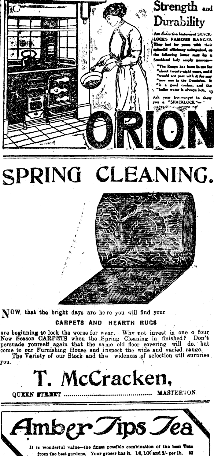 u^ I ■*NP m$ m?m m \ :X:^ <|B <o* '.ill "LiS Em * Am &£»<*»• litfiwrf SHACKSACKS FAMOUS ftANGES. '*• Ml— to* tmm mm t» SaatUurf My »*** •tint* «w*aty-«%lrt s «mU m* put w*k klmmv • food cmksr, mai lfc* V "Wtor wntar » ahrayi bob. cm A«lt your IronswajoT t» ilmw r «■,■■■ e SPRING CLEANING. £^ II SI £2 38; § W£ £g I *rf£ mi M S£ m. m. TVTGW. that the bright days are here you will find your CARPETS AND HEARTH RUGS . are beginning to look the worse for wear. Why not invest in one o four New Season OAEPETS when the..Spring Cleaning in finished? Don't persuade yourself again that the same old floor covering will do. but come to our Furnishing House and i nspect the wide and varied range. The Variety of our Stock and the selection will surprise you. f T. McCracken, QUJHIN iTWHET ...» MAST3CRI ON. It ii wonderful ralne—tho finttt poulblo combination of th» beat fltM from tke bwt gardene. Tour groaer haa it. 1/8,1/10 and |/- per lb. it