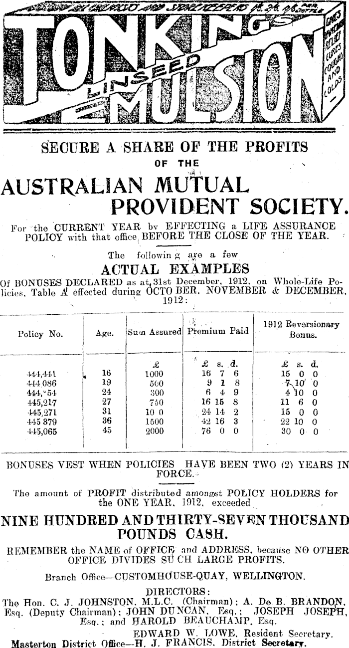 SECURE A SHARE OP THE PROFITS OF THE AUSTRALIAN MUTUAL PROVIDENT SOCIETY. For the CURRENT YEAR bv EFFECTING a LIFE ASSURANCE POLICY with that office, BEFORE THE CLOSE OF THE YEAR. The followin s are a few ACTUAL EXAMPLES Of BONUSES DECLARED as at, 31st December, 1912, on Whole-Life Policies, Table A' effected during OCTO BER, NOVEMBER & DECEMBER, '■*»■•■'. _., 1912 Reversionary Policy No. Age. Sum Assured Premium Paid Bonus. +44,441 444.086 444, "64 445,217 445,271 445 379 445,065 16 7 6 9 18 6 4 9 16 15 8 24 14 2 42 16 3 76 0 0 15 0 0 ■*vltf 0 410 0 11 6 0 15 0 0 22 10 0 30 0 0 BONUSES VEST WHEN POLICIES HAVE BEEN TWO (2) YEARS IN FORCE. The amount of PROFIT distributed amongst POLICY HOLDERS for the ONE YEAR. 1912. exceeded NINE HUNDRED AND THIRTY-SEVRN THOUSAND POUNDS CASH. REMEMBER the NAME of OFFICE and ADDRESS, because NO OTHER OFFICE DIVIDES SU CH LARGE PROFITS. Branch Office—CUSTOMHOUSE-QUAY, WELLINGTON. DIRECTORS: The Hon. C. J. JOHNSTON. M.L.C. (Chairman) ; A. De B. BRANDON. Esq. (Deputy Chairman); JOHN DUNCAN, Esq.; JOSEPH JOSEPH, Esq.; and HAROLD BEAUCHAMP. Esq. EDWARD W. LOWE, Resident Secretary. Masterton District Office—H. J. FRANCIS. District Secretary.