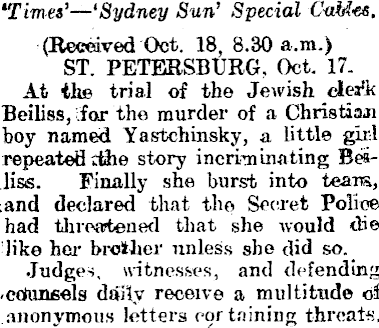 Times' —'Sydney Sun' Special Cables. (Received Oct. 18, 8.30 a.m.) ST. PETERSBURG, Oct. 17. At the trial of the Jewish cleA Beiliss, ifor the murder of .a Christian boy named Yastchinsky, a little gii-1 repeated dihe story incriminating Bea.lias. Finally she burst into tears, ; and declared that the Secret Police had threatened that she would die like her brother unless she did so. Judges, witnesses, and defending -cctuneels daily receive a multitude of anonymous letters pertaining threats.