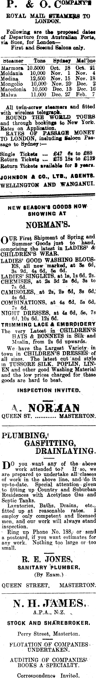 P. & O.C mPAS ™ ROYAL MAIL STXAMEgS TO LONDON. Following are tb« proposed dat«« of Departure from Australian Porto, via Sues, for London— First and Second Saloon only. Mteamer Tons Byd—y Mal'bne Marmora 10.6000 Oct. J.B Oct. 21 Moldariia 10,000 Nov. 1 Nov. 4 Medina 12,500 Nov. 15 Nor. 18 Mongolio 10,000' Nov. 29 ; Dec. 2 Macedonia 10,500 Deo. 13 : Dec. 16Malwa 11,000 Dec. 27 Feb. 7 All twin-fiercer aU&mars and fitted with wireless telegrapk. ROUND THE WORLD TOURS and through booking* to New York*. Rates on Application. RATES OF PASSAGE MONEY TO LONDON, imduding Saloon Passage to Sydney:— Single Ticket! <... £47 8s to £BB Return Tickets ... !£75 18# to £lßß' Return Tickets available for 9 years. JOHNSON A CO., LTB„ AGENTS. WELLINGTON AND WANGANUI. NEW SEASON'S GOODS NOWSHOWING AT NOBMAN'S. /~|UR First Shipment of Spring Mi Summer Goodg juflt to handy comprising the latest in LADIES 1 & CHILDREN'S WEAR. LADIES' GOOD WASHING BLOUSES, all new marked, at 8s Bd, 3a 9d, 4s 6d , 5s 6d. LADIES' SINGLETS, at Is, Is 6d, 2s. CHEMISES, at 2a 3d 2s 6d, Ss to 7s 6d. CAMISOLES, at 2s, 2» «d, 8s 6d,' 4s 6d. COMBINATIONS, at 4a 6d, 5s 6d, 7s 6d. NIGHT DRESSES, at 4a 6d, ss, 7s 6d, 10s 6d, 12s 6d. TRIMMING LACE & EMBROIDERY The very Latest in CHILDREN'S HATS & BONNETS in Silk and Muslin, from 2s 6d upwards. We have the Largest Variety , in' town in CHILDREN'S DRESSES" of all sizes. The latest cut'and style in TUSSORE SILK, POPLIN, LINEN and other good Washing Material and the low prices charged for thfeae goods are hard to beat. INSPECTION INVITED. 4. NORMAN QUEEN ST. MASTERTON. PLUMBING,* GASFITTING, DRAINLAYING. T\o you want any of the above work attended to? If so, we are prepared to undertake allclaases of work in the above line, and> do it up-to-date. Special attentions given to fitting up Country and Suburban Residences with Acetylene Gas and Septic Tanks. Lavatories, Baths, Drains,- etc., fitted up at reasonable ratee. i employ only competent and licensed men, and our work will always stand inspection. ~ Ring up Phone No. 188,- or send a postcard, if you want estimates for any work. Nothing too large or too small. 1 R.E.JONES, SANITARY PLUMBER, (By Exam.) QUEEN STREET, MASTERTON. N.H.JMES, A.P.A., N.Z. . STOCK AND SHffREBROKER. Perry Street, Masterton. FLOTATION OF COMPANIES - UNDERTAKEN. AUDITING OF COMPANIES' BOOKS A SPECIALTY. Correspondence Invited.